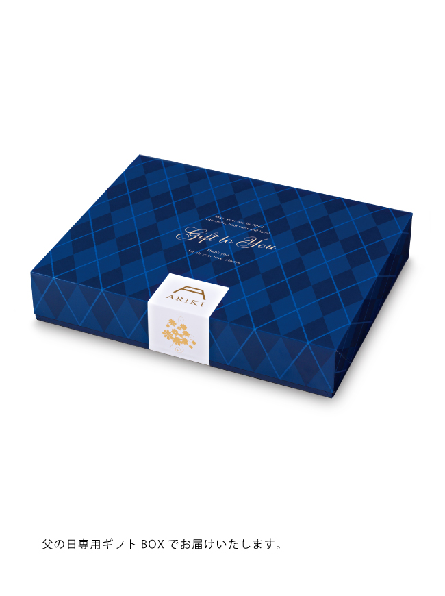 父の日に向けて開発した専用ギフトBOXです。ネイビーのアーガイル柄が上質な大人の男性に相応しいデザインとなっており、贈り主様の感謝の気持ちを伝えます。