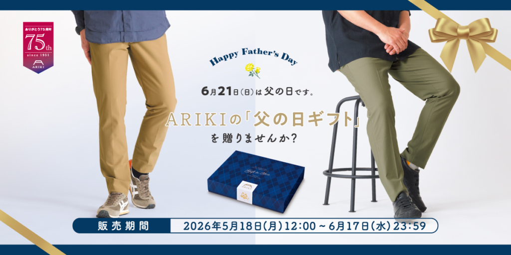 この度、ARIKIメンズパンツが1本入った(専用ギフトBOX入り)『父の日ギフトセット』をARIKIオンラインショップ(https://www.jyoshitu-gocochi.com/)限定で2026年5月18日(月)12:00~6月17日(水)23:59の期間販売、販売いたします。